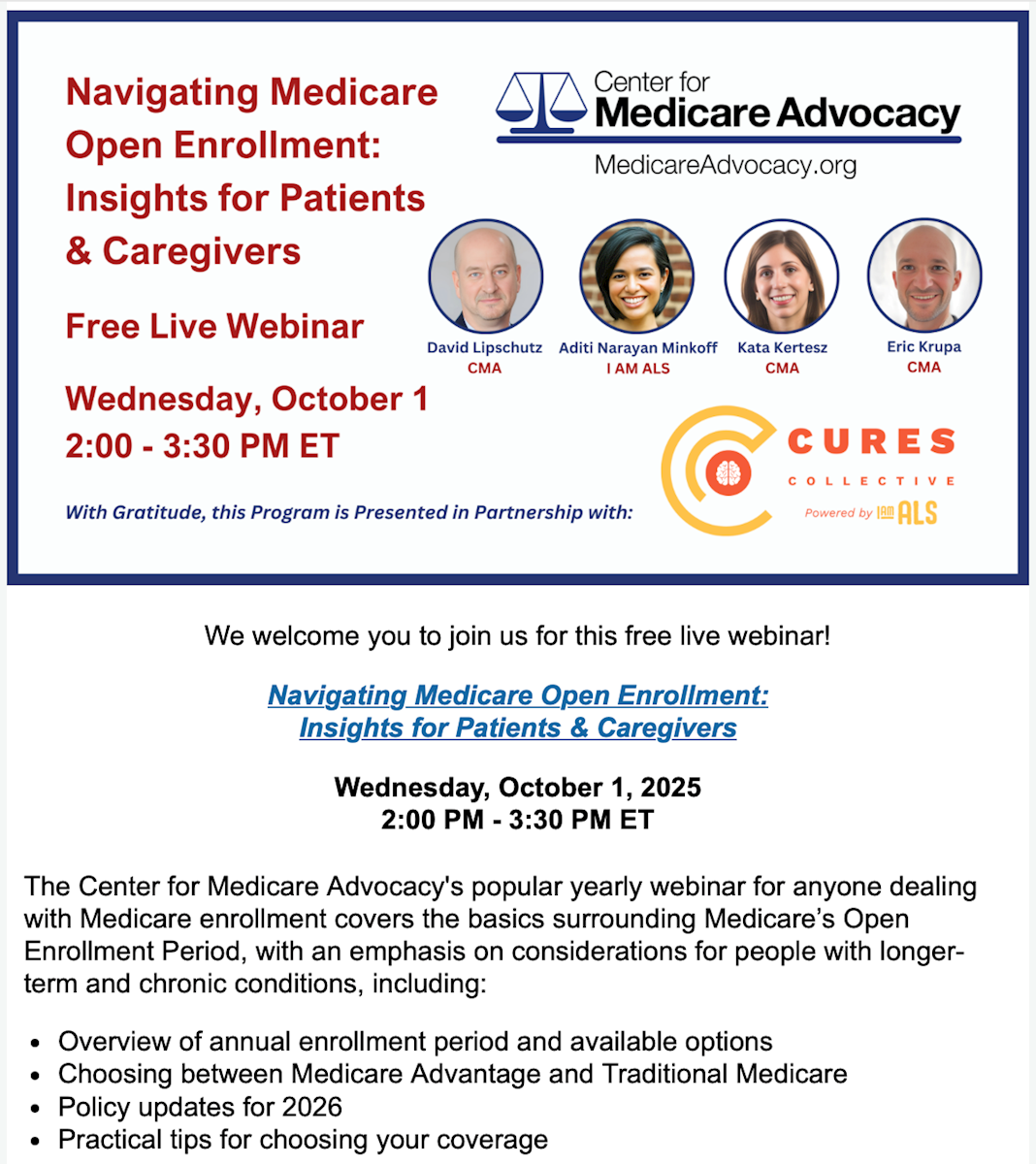 Today at 2:00PM Eastern, the Center for Medicare Advocacy is hosting a free webinar to help current and upcoming Medicare beneficiaries understand their different plan options. Click here or on the image below for more details and to register.